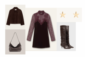 Me+Em Fluid Mini Dress, Ba&sh Milas Straight-Cut Jacket, Vestirsi Eden Dark Chocolate Leather Shoulder Bag, Scarosso Barbara Boots, Catbird Tiniest Dancer Stud