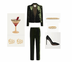 L’Agence Brooke Velvet Blazer and Rebel Velvet Trouser, Judith Leiber Couture Martini Manhattan Crystal Minaudiere, Aquazzura Studio 105 Mesh-Paneled Suede Pumps, David Yurman Sculpted Cable Flex Bracelet and Ring, Shashi Katerina Triple Pave Hoop Earrings