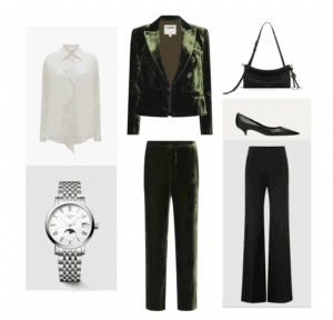 L’Agence Brooke Velvet Blazer and Rebel Velvet Trouser, Victoria Beckham Ruffle Blouse, Veronica Beard Kalinda Wide-Leg Ponte Pant, Alaïa Le Click Small Leather E/W Shoulder Bag, The Row Liisa Leather Kitten-Heel Pumps, Longines Elegant Collection Moonphase