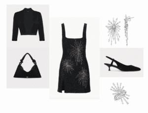Staud Le Sable Dress Firework, Cult Gaia Hera Nano Shoulder Bag, Elie Tahari Scallop Cardigan, Ralph Lauren Beaded Satin Slingback Heel, JJ Jewelry Star Storm Diamond Burst Earrings and Celestial Comet Diamond Burst Ring