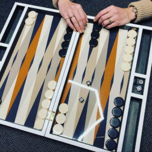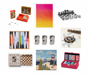 Top Row: Jonathan Adler Leopard Lacquer Card Set, Areaware Large Gradient Puzzle Bundle, The New Yorker Magazine Chess Set Middle Row: Colorful Backgammon Set, Gladfellow Titanium Dice Set, Personalized Domino Train Hub Set Bottom Row: The Minimalist Wood Chess, Liberty Puzzles First Tracks, Mark & Graham Leather Poker Set