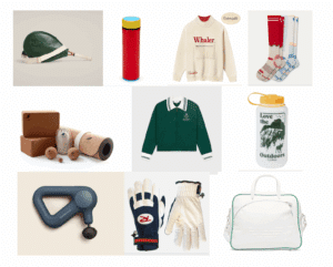 Top Row: Wilson Retro Leather Racket Cover, George Sowden Thermal Flask, Tombolo Customizable ‘Boston Whaler’ Sweater, Bombas Women’s Ski & Snowboard Starter Sock 2-Pack Middle Row: 42 Birds “The Flock” Yoga Bundle, Sporty & Rich Crown Tennis Zipped Cardigan, L.L. Bean Nalgene Ultralite Wide Mouth Water Bottle Bottom Row: Theragun Relief, Rossignol Throwback Glove, Adidas Bowling Logo-Embossed Shoulder Bag